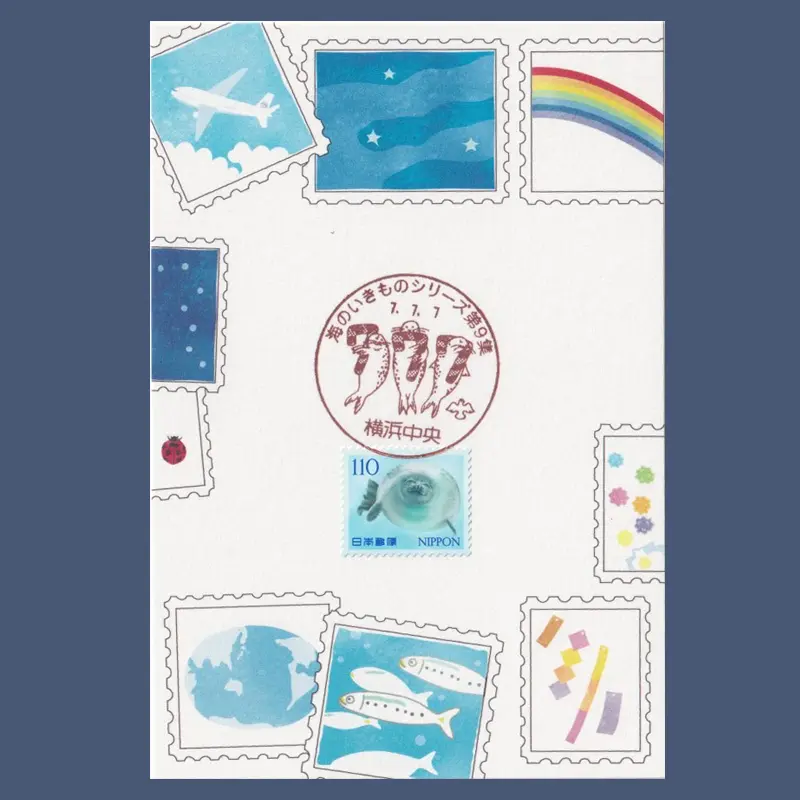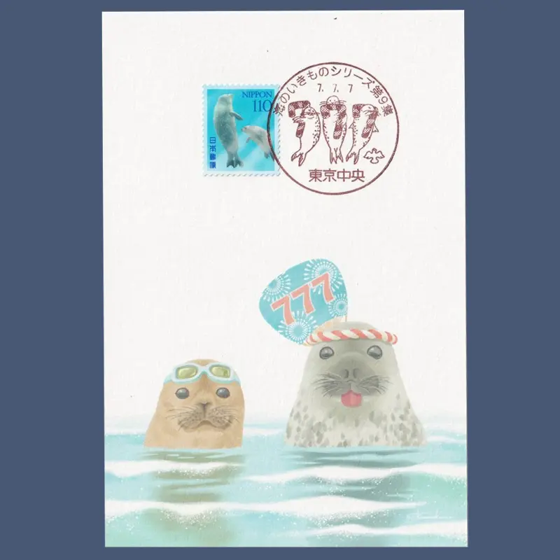 今日発売の切手は「海のいきものシリーズ 第9集」という特殊切手で、アザラシの絵がなんとも愛らしいのだが、その手押し印の絵柄が仕掛けられた内容だった。絵柄の中にまで「777」と入れられており、発表時から「これは久しぶりの激混みだ」と予想していた人も多かったことだろう。